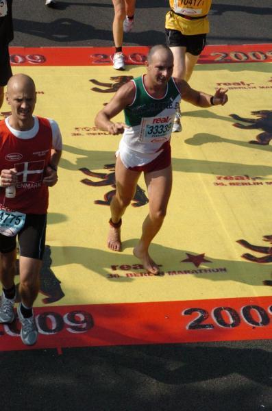 Sono molti gli episodi da ricordare per questa avventura Berlinese tra cui le persone che dicevano: “ti ho visto alla half marathon di Carmagnola”, “io alla maratona di Padova”, “io Treviso”, “io Roma” …….poi c’è il mio amico sardo che mi dice” ma le fai tutte!!!!”. Non Posso nemmeno dimenticare i miei amici di viaggio che abbiamo condiviso 4 giorni speciali. Ma ecco il giorno della gara bellissima giornata con 44000 partenti da 115 paesi alle porte di Brandeburgo si parte e tento di accelerare per provare a fare un record personale, corro molto forte tanto che alla prima metà di gara ho un vantaggio rispetto il mio personale di 850 metri.I connazionali in gara mi aiutano incitandomi,salutandomi,incoraggiandomi per la mia impresa a piedi nudi, anche gli stranieri provenienti da 115 paesi lo facevano ma io non capivo cosa mi dicessero di preciso (chissà se mi prendevano in giro?). Appena arrivo al 32^ km il caldo si fa sentire(almeno 25 gradi) e inizio a perdere terreno perdendo la speranza del record personale. Comunque mi pongo l’obbiettivo delle 3 ore e 30 minuti che riesco al traguardo rispettare. E stato un ottimo tracciato veloce ma dovevo fare attenzione a tantissimi vetri rotti. Il pubblico non era particolarmente attratto o stupito per la mia particolarità di correre a piedi nudi, neanche quando cercavo il loro sostegno alzando le braccia e urlando li sentivo per la prima volta distaccati.Questa è stata la mia 14^ maratona.